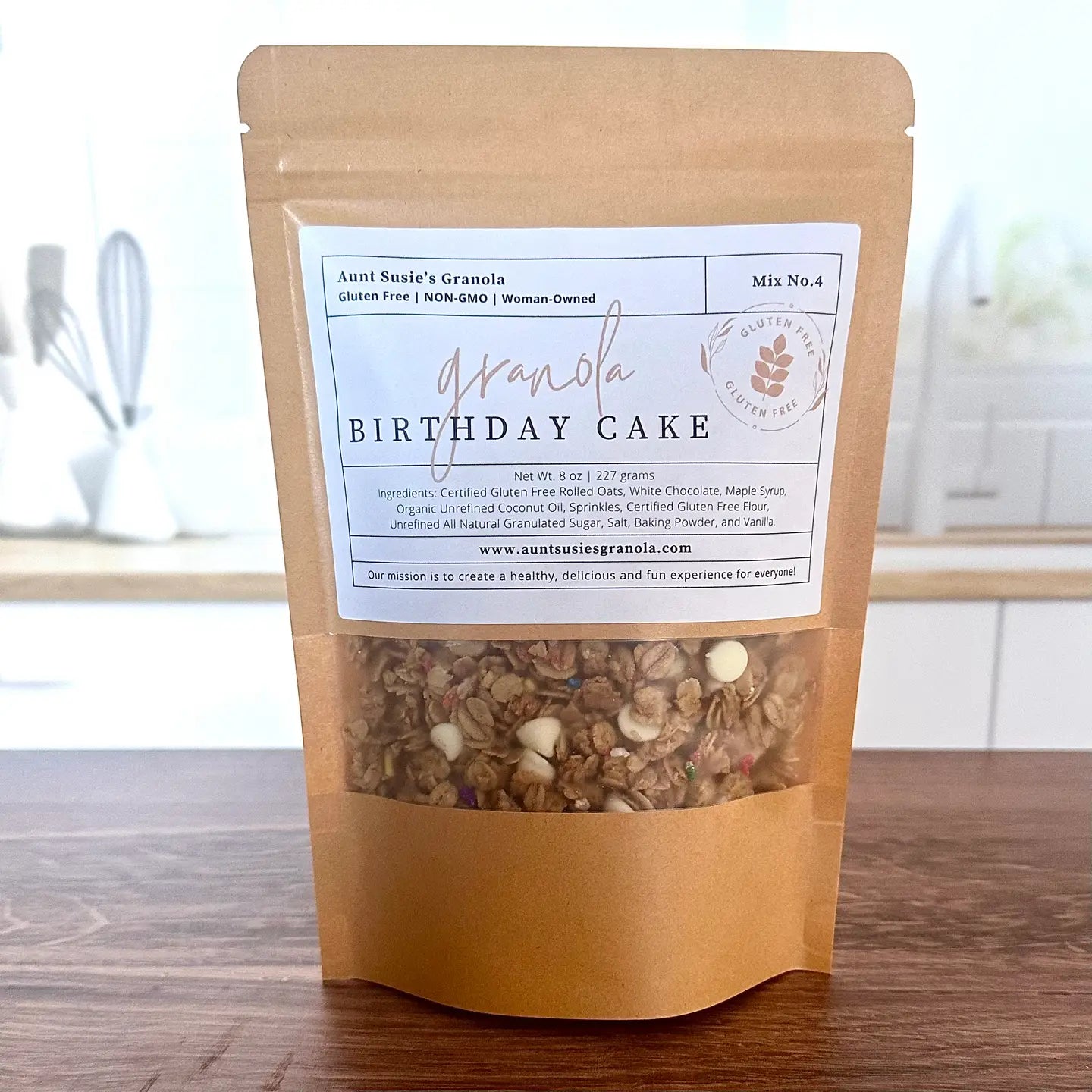 Our Birthday Cake Granola is a healthy twist on vanilla confetti cake! It has everything from the rich and soft texture of birthday cake icing, right down to the fun and colorful sprinkles! Ingredients: Rolled Oats, Coconut Flakes, Maple Syrup, Coconut Oil, White Chocolate Chips, Sprinkles, Vanilla, Salt, Flour, Granulated Sugar, Baking Powder and a whole lot of LOVE! All products produced in our kitchen are 100% gluten free and we take pride in sourcing the finest ingredients for our granola blends.